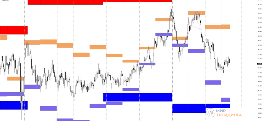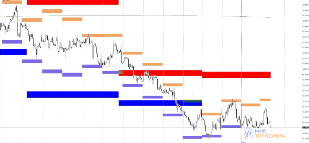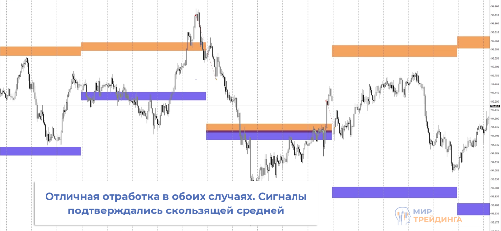 Модификация предполагает использование мультитаймфреймовой версии скользящей средней. Она позволяет отображать на любом таймфрейме МА с нужного временного интервала. Можно отображать, например, дневную МА и работать на М5 или Н1.