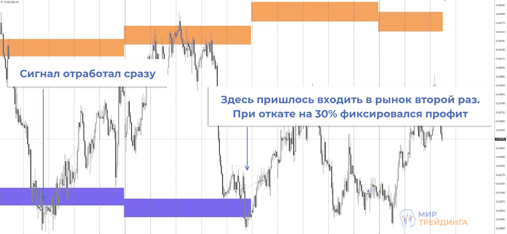в первой сигнал отработал сразу, тейк размещался на уровне коррекции 30%,