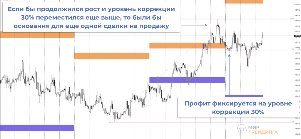 Тейк-профит фиксировался на уровне коррекции 30% от предыдущей бычьей волны. Это дало порядка 900 пипсов по каждой сделке.