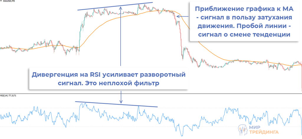 простоту. Имеется в виду простота интерпретации сигналов. Какой бы ни была логика расчетов смысл показаний понятен всем. За счет этого даже начинающий трейдер быстро осваивает возможные сигналы, может комбинировать несколько индикаторов. Простейший пример – можно использовать МА для определения доминирующей силы на рынке (продавцы или покупатели), а пробой линии используется для выявления моментов смены тенденции. В роли фильтра может использоваться осциллятор RSI;