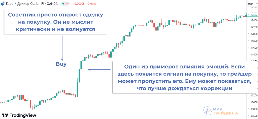 Советник в той же ситуации просто откроет сделку, если выполнены все условия для входа в рынок.
