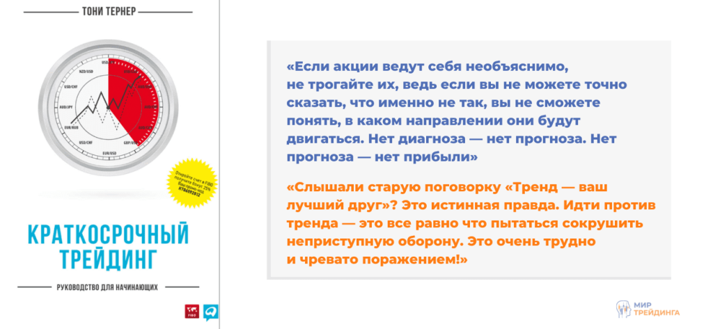 Тернер рассказывает о торговле акциями. Вся информация касается фондового рынка. Однако, это не должно смущать тех, кто торгует на валютном рынке. Дело в том, что фундаментальные принципы и причины движений в целом схожи для всех рынков и финансовых инструментов. Конечно, есть различия, но это в большей степени детали, которые следует изучать уже после основательного знакомства с рынком. Например, автор указывает, что нет никакого смысла пытаться торговать какой-либо бумагой без понимания ее текущего состояния. То же самое можно сказать и про любой другой инструмент – валютную пару, товар, цифровой актив или долговое обязательство. Простыми словами, Тернер объясняет общие моменты, характерные для трейдинга в краткосрочной перспективе в целом.