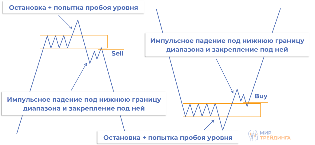 Для бычьей модели схема меняется зеркально. Продавцы пытаются пробить нижнюю границу диапазона, это не удается и график в итоге закрепляется над верхней границей. Сценарий рассматривается как сигнал для покупок.
