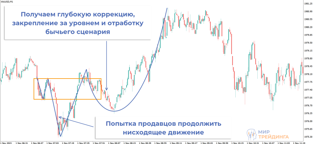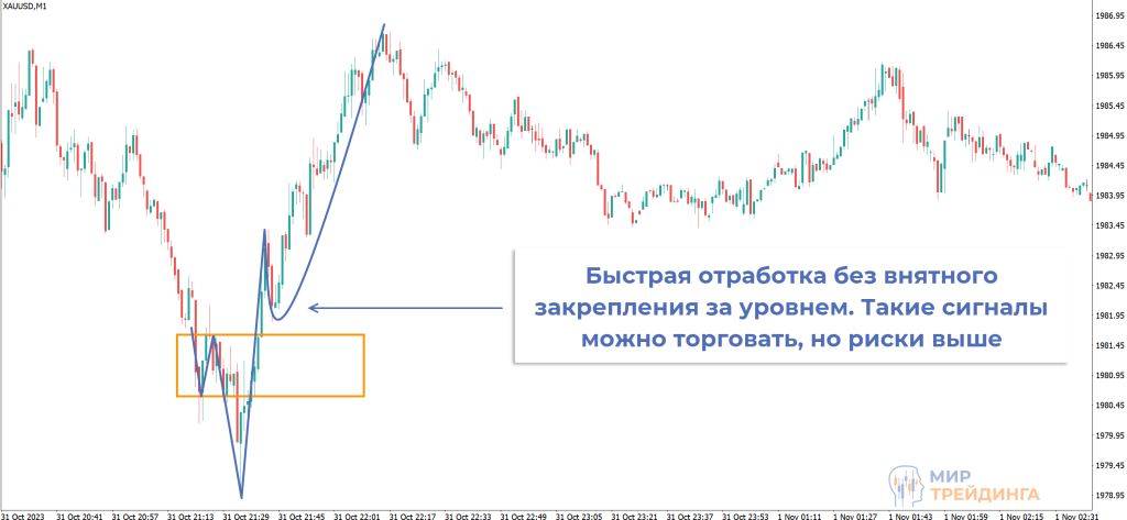 Закрепления над уровнем не было, коррекция оказалась недостаточно глубокой. Такие точки входа также берутся в работу, но их надежность несколько ниже по сравнению с полноценным закреплением.