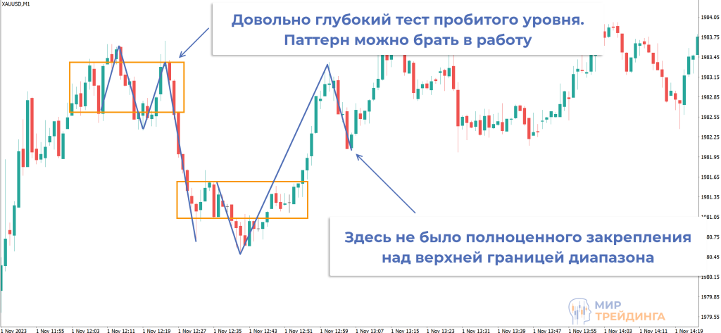 При высокой волатильности формирование паттерна происходит очень быстро. В примере используется М1, поэтому пробой поддержки и его отмена заняли меньше 10 минут.
