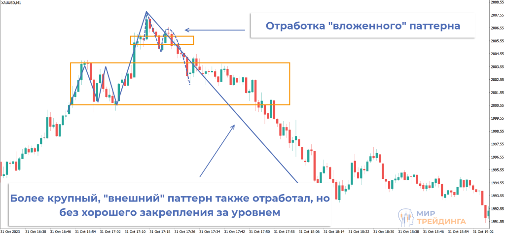 В примере при формировании ложного пробоя во «внешнем» паттерне появилась более мелкая «внутренняя» модель. Видно, что оба сигнала могли принести прибыль.