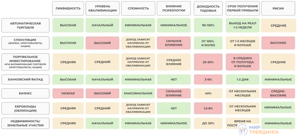 Сравнение разных типов инвестиций