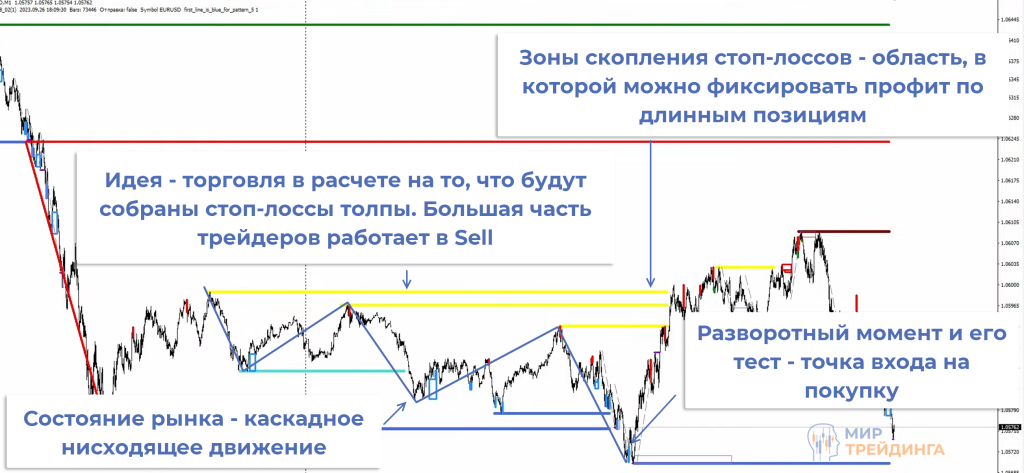 В примере наблюдается каскадное движение. Это означает, что после второго отката уже можно искать разворотные точки входа с целью в ближайших зонах скопления стоп-лоссов. Это еще не точка входа, а только первые 2 этапа.