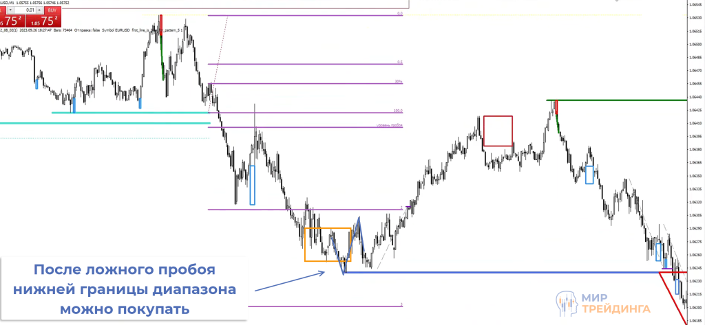 Остается дождаться сигнала. Точка входа на покупку формируется после ложного пробоя поддержки и формирования разворотного момента (прямоугольник на графике). При тестировании разворотного момента получаем возможность для покупок. Заранее известны цели, это уровни скопления стопов тех, то пытался работать в Sell.