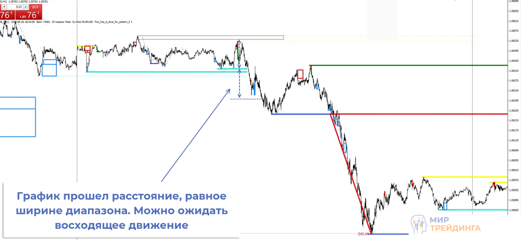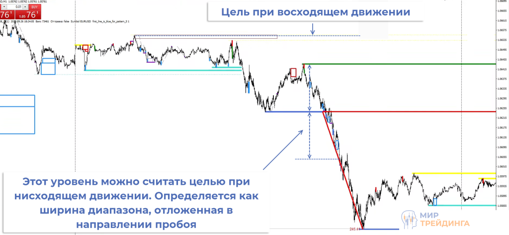 продолжается каскадное движение и пара идет вниз. Для определения целевого уровня в направлении пробоя откладывается ширина диапазона, здесь можно фиксировать прибыль,