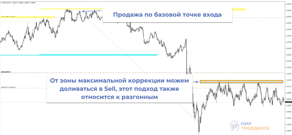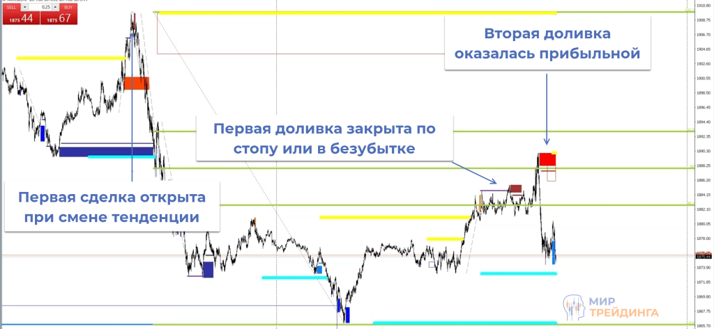 Разгонная доливка по ходу движения. Этот сценарий может применяться при входе от уровней глубокой коррекции. Например, вход выполнен до продолженного движения, после глубокой коррекции получаем шанс для доливки в том же направлении. Может применяться тот же объем, что и в первой сделке.