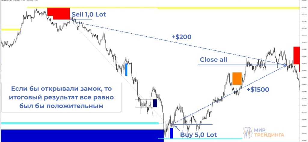Если бы в этой ситуации трейдер входил в замок, то все равно получил бы прибыль. Но в отличие от предыдущего сценария несколько уменьшился профит по короткой позиции.