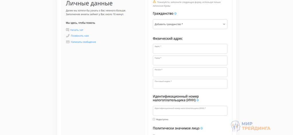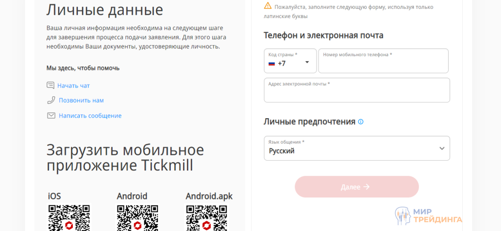 указывается номер телефона, email, предпочтительный язык общения. Телефон и номер сообщайте реальные, иначе брокер Тикмилл не сможет связаться с вами;