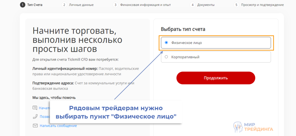 на следующем этапе брокер Tickmill сообщает, что понадобится для регистрации и предлагает выбрать тип счета – физлицо или корпоративный. Корпоративный выбирается только при условии, что трейдер будет работать от лица некой компании;