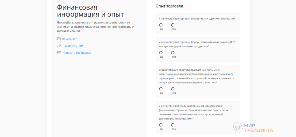 опыт торговли. Здесь достаточно просто выбрать подходящие пункты из предложенных вариантов;