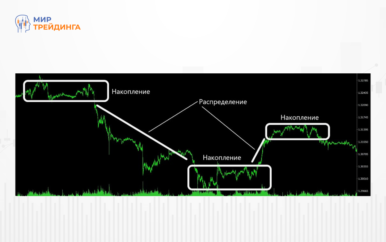 Фаза накопления формируется после продолжительного нисходящего тренда и представляет собой период консолидации, где Smart Money постепенно накапливает позиции.