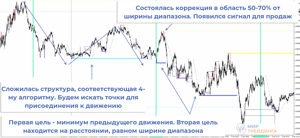 При работе по этому алгоритму второй тейк-профит находится на расстоянии, примерно равном ширине диапазона. Это расстояние откладывается от точки пробоя уровня поддержки, построенного по Low.