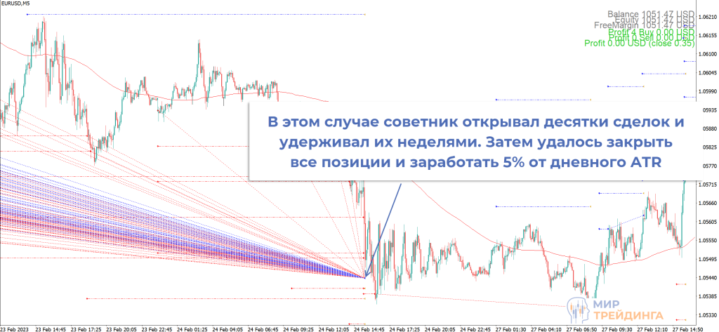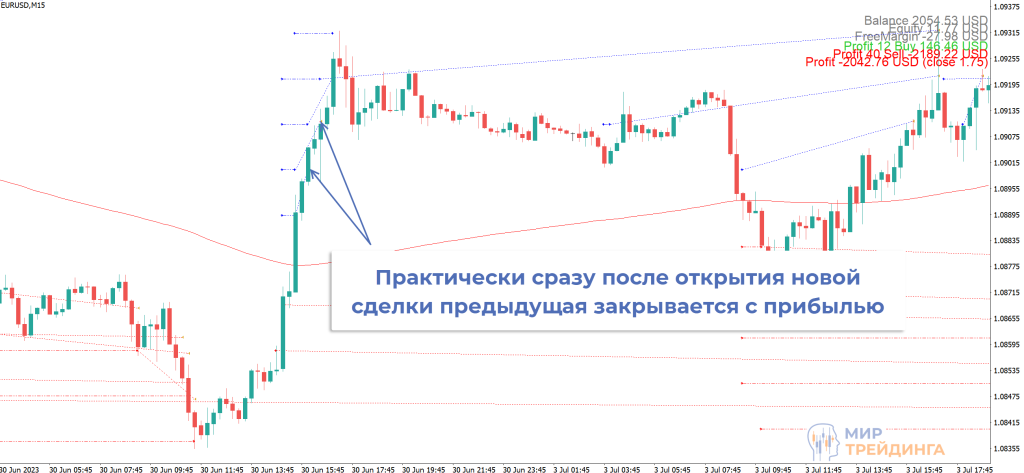 При стандартных настройках профит чуть больше, чем шаг между ордерами сетки. На сильных движениях заметно, что практически сразу после открытия новой сделки закрывается предыдущая позиция. Это существенно снижает количество открытых ордеров.