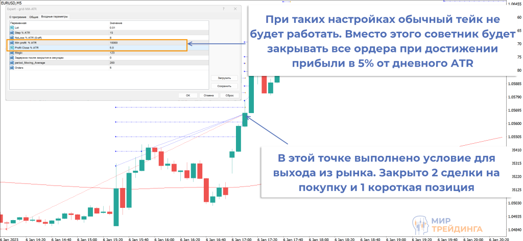 Эта опция используется для закрытия всех сделок обеих сеток. При стандартных настройках все позиции будут закрыты, если совокупная прибыль составит 25% от дневного ATR.