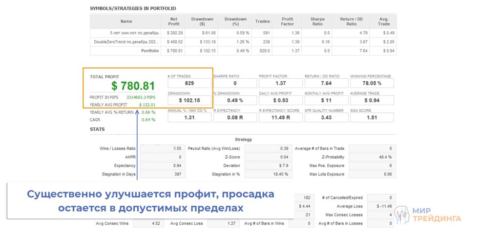 Но если объединить оба отчета (это можно сделать в Quant Analyzer), то окажется, что итоговый результат существенно улучшается. При совместной работе обоих советников профит оказался равен $780,81, а просадка в моменте не превышала $102,15. При таких исходных данных фактор восстановления увеличивается до 7,64 – больше, чем у обоих роботов при их использовании поодиночке.