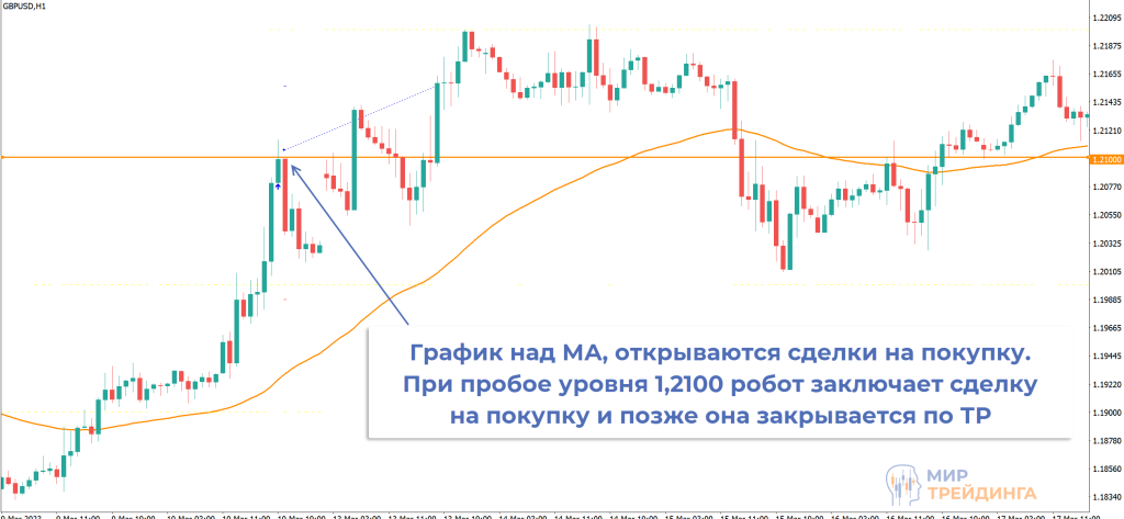 Пока график остается над линией МА советник будет работать только при пробое уровней снизу-вверх. Если свечи под линией мувинга, то для продаж нужен пробой поддержки – это выглядит как пробой уровня сверху-вниз.