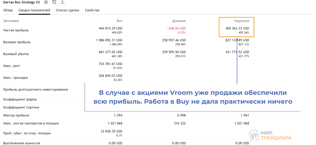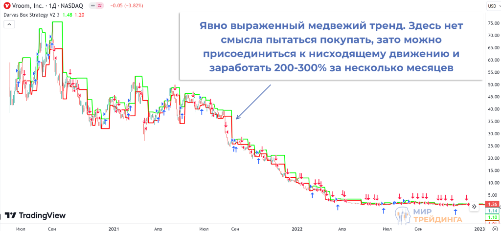 В примере использовались акции Vroom. Компания проходила IPO в 2020 г., сразу после листинга бумаги росли и в моменте их стоимость превышала $70. Затем рынок развернулся, в итоге котировки снизились до $1-$2. В рамках масштабного падения подход Дарваса отлично работал уже при продажах, сделки на покупки обеспечили небольшой убыток.