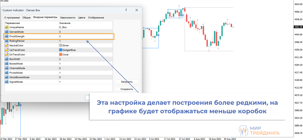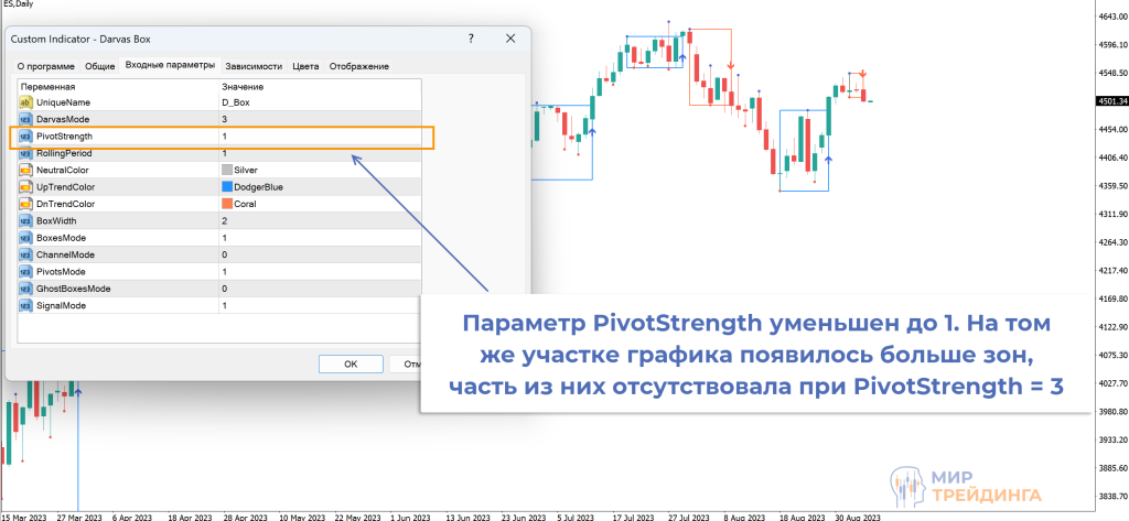 - PivotStrength – влияет на частоту отрисовки коробок. Чем ниже число, тем больше диапазонов будет выделяться. Я рекомендую не занижать этот параметр, в тестах стабильно себя показывают значения 3 и 4;