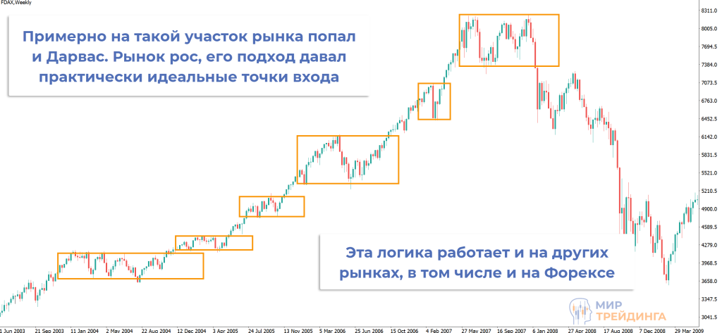 Подход Дарваса сводится к тому, что на графике постоянно формируются «коробки» и можно торговать при их пробое. Для фондового рынка характерны периоды затяжных бычьих трендов. По ходу восходящего движения регулярно появляются диапазоны (коробки):