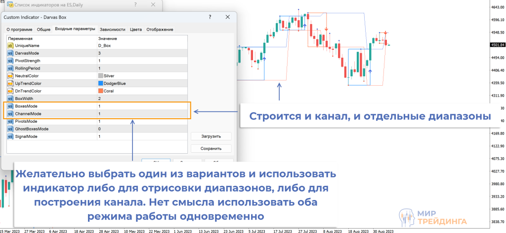 - DarvasMode – вариант реакции на пробой/касание границы диапазона, задается числом от 0 до 3. Рекомендую использовать 3, в этом сценарии диапазон будет окрашиваться в соответствующий цвет только после закрытия свечи за ним;