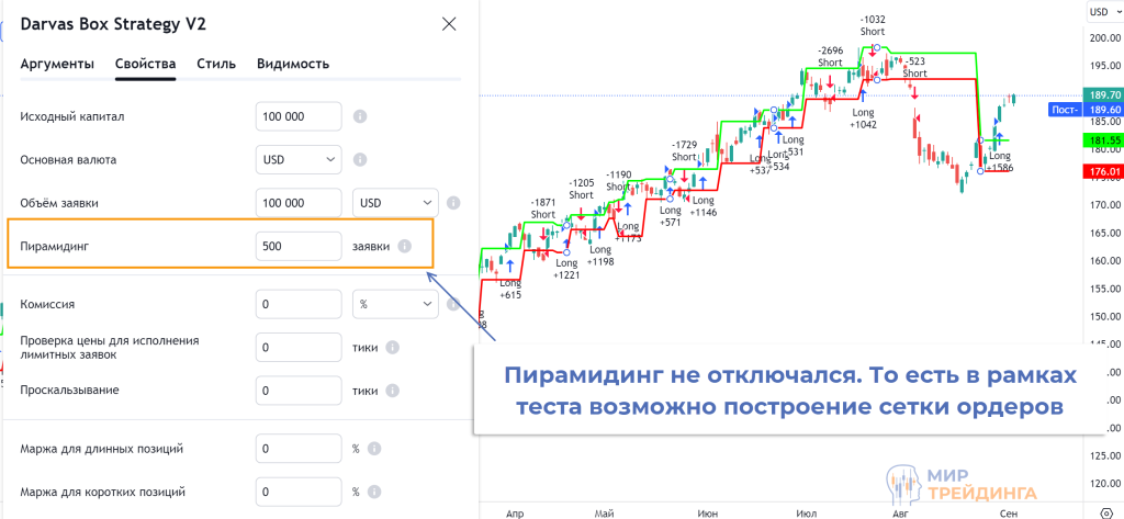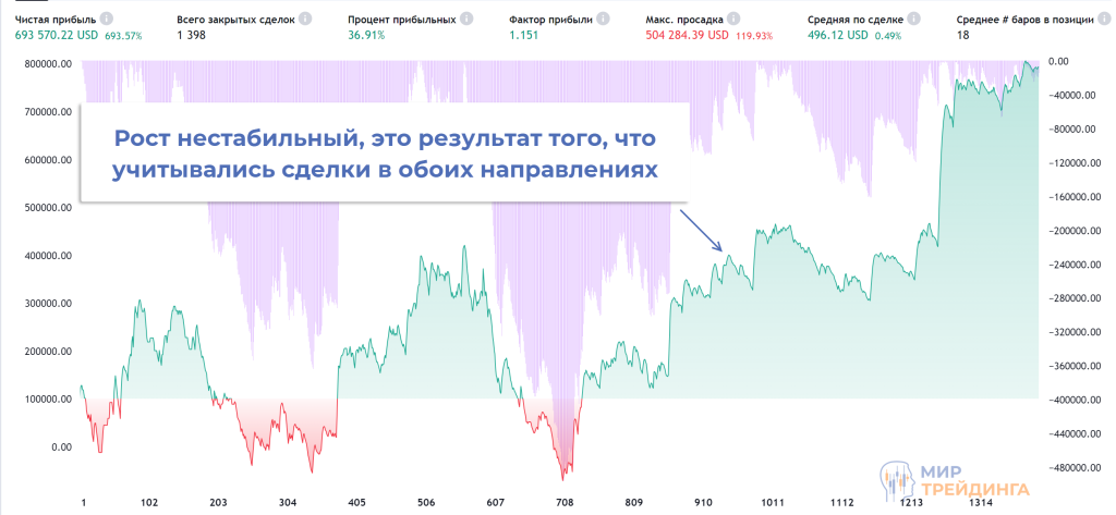 Но есть и обходной путь – можно использовать TradingView. В нем есть соответствующие стратегии и можно проверить их результат на истории. В примере использовался фиксированный лот и пирамидинг, максимальное число последовательных входов в одном направлении было ограничено 500.