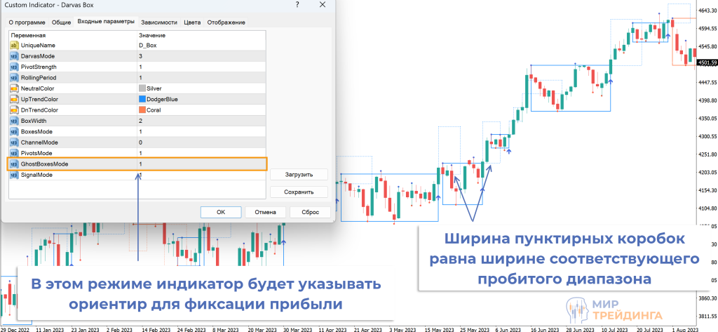 - GhostBoxesMode – при активации индикатор будет указывать целевые уровни при пробое границы коробки. Считается, что после пробоя уровня график пройдет в направлении пробоя расстояние, примерно равное ширине коробки. Darvas Box выделяет пунктиром зону той же ширины, ее границу можно использовать как ориентир. Например, для перевода в безубыток или фиксации части прибыли;