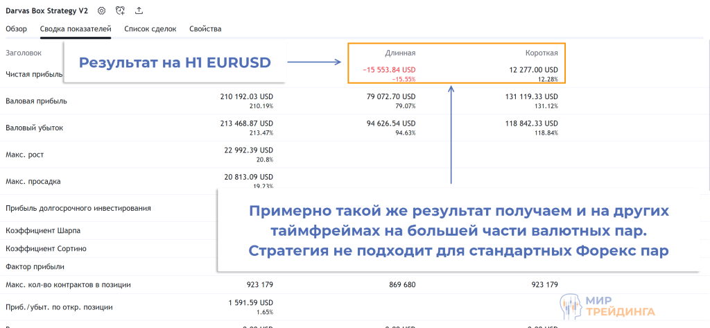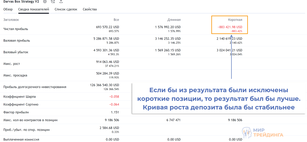 Это результат того, что в TradingView нельзя активировать работу только в Buy или в Sell, в настройках просто нет соответствующего пункта. При работе по методу Дарваса нужна фильтрация состояния рынка. Нет смысла брать в работу медвежьи сигналы на откровенно бычьем рынке и наоборот.
