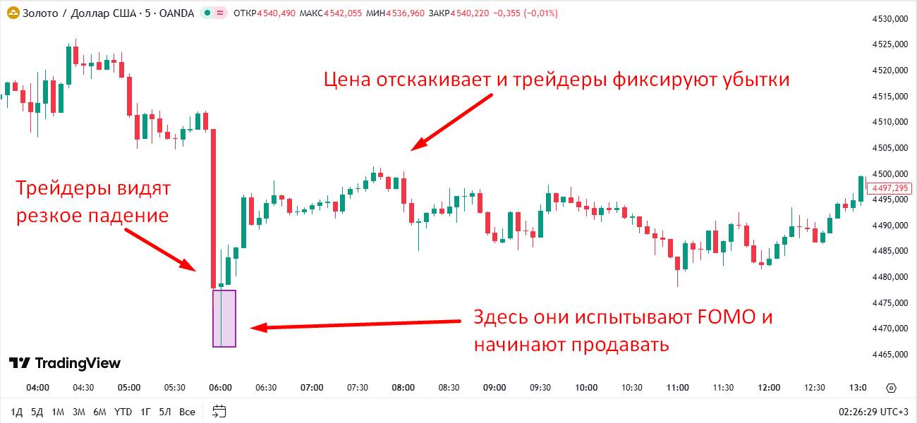 Результат предсказуем: сделка открывается на пике импульса, где профессионалы уже выходят, фиксируя прибыль. FOMO превращает трейдера в того самого участника «толпы», которая реагирует, а не планирует.