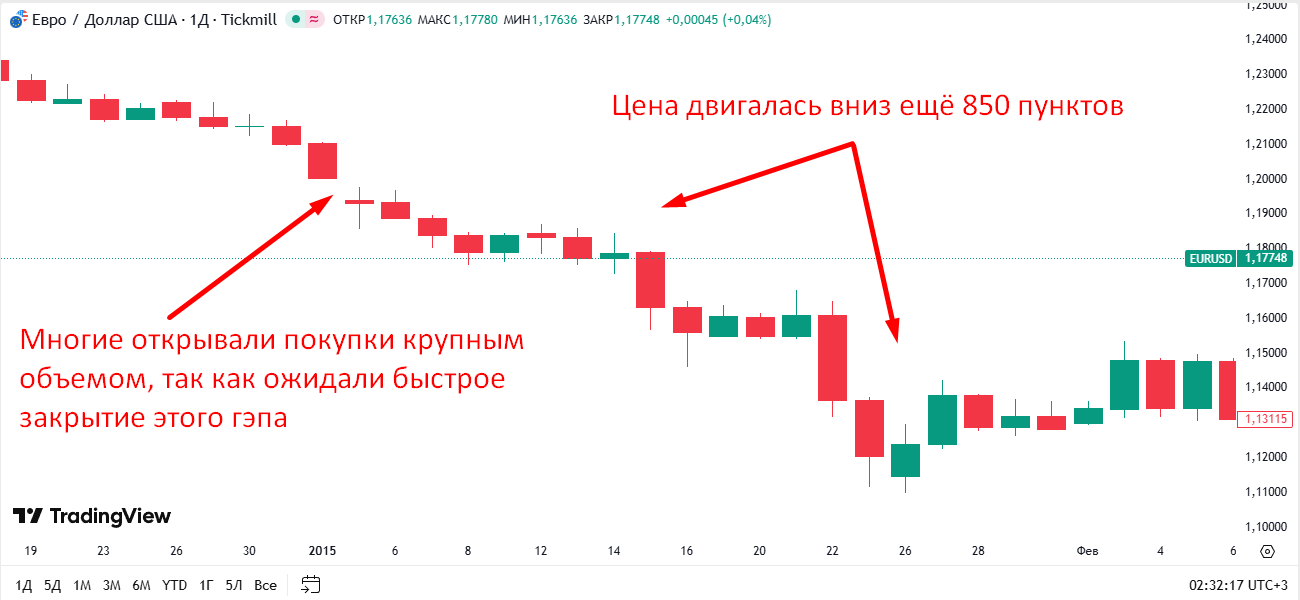 Посмотрите на этот пример выше. Многие знают, что гэпы на валютных парах EUR/USD и GBP/USD практически всегда перекрываются. И это провоцирует трейдеров открывать позиции очень большого объема после появления гэпов. Они действительно почти всегда перекрываются, но когда этого не происходит, многие несут колоссальные убытки. Рынок редко прощает избыточную самоуверенность. Достаточно одного разворота, и прибыль исчезает. Жадность разрушает даже эффективные стратегии, превращая системную торговлю в хаотичные действия, где решения принимаются не из расчета, а под воздействием эмоций.