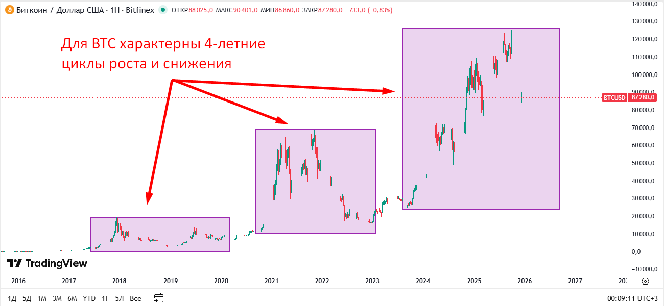 Биткоин давно перестал быть просто цифровым активом. Он стал отдельным рыночным феноменом с уникальной логикой движения и собственной цикличностью. Его поведение сложно назвать стабильным, но именно волатильность делает этот инструмент одним из самых интересных для трейдеров. Основой долгосрочных циклов биткоина является халвинг – знаковое событие, при котором каждые четыре года уменьшается вознаграждение майнерам за добытый блок. Это сокращает приток новых монет в обращение, снижая предложение и создавая естественный дефицит. Исторически халвинг становился катализатором роста, после которого следовали фазы эйфории, коррекции и нового накопления.