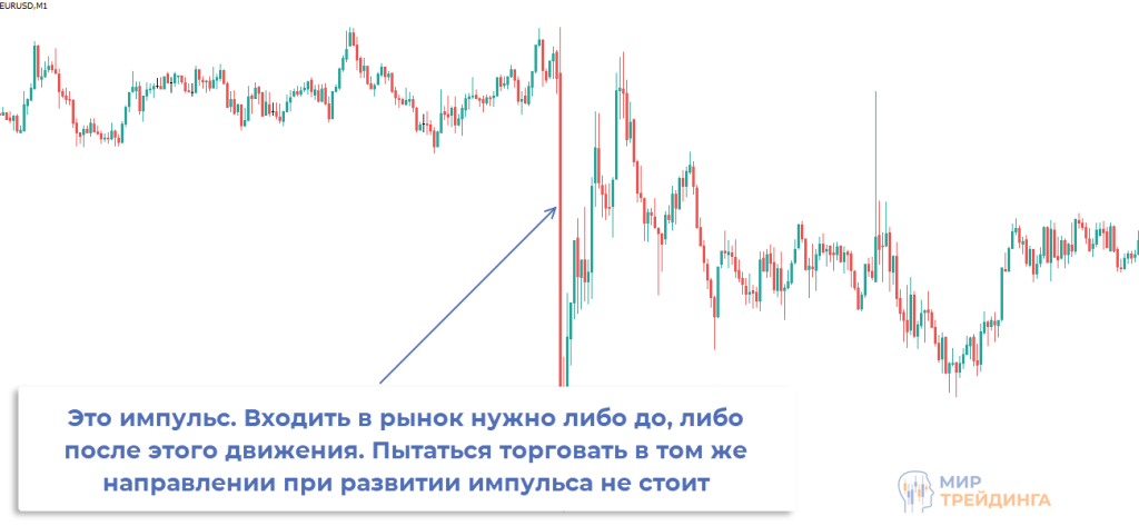 Импульс на графике – это резкое ускорение движения на 1-2 свечах, они явно выделяются на фоне предыдущих свечей. Есть несколько причин такого поведения цены. Оно может объясняться: