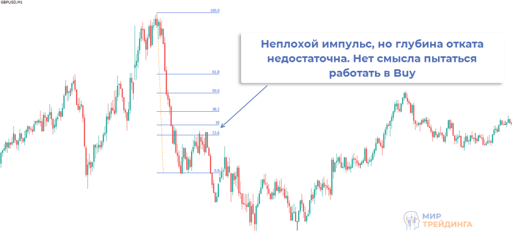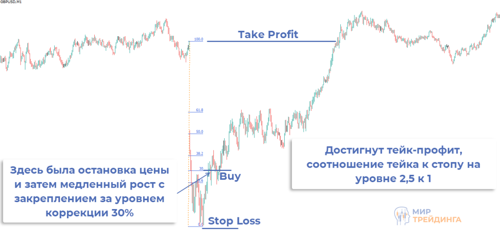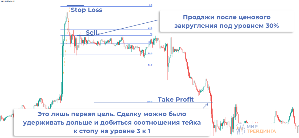 В примере ниже на М15 появилось эталонное импульсное движение, оно заняло несколько свечей. Затем развился встречный импульс и график ушел под уровень 30%. Точка входа формировалась после ценового закругления и ретеста уровня 30% снизу.