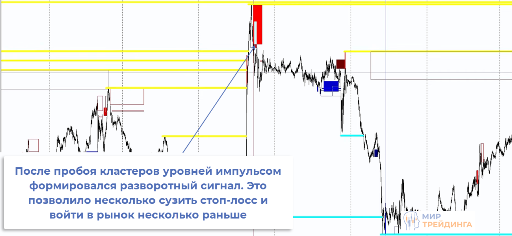 В рамках импульса пробит кластер разворотных зон (линии желтого цвета). Затем сформировался разворотный момент и на его ретесте получили точку входа на продажу.