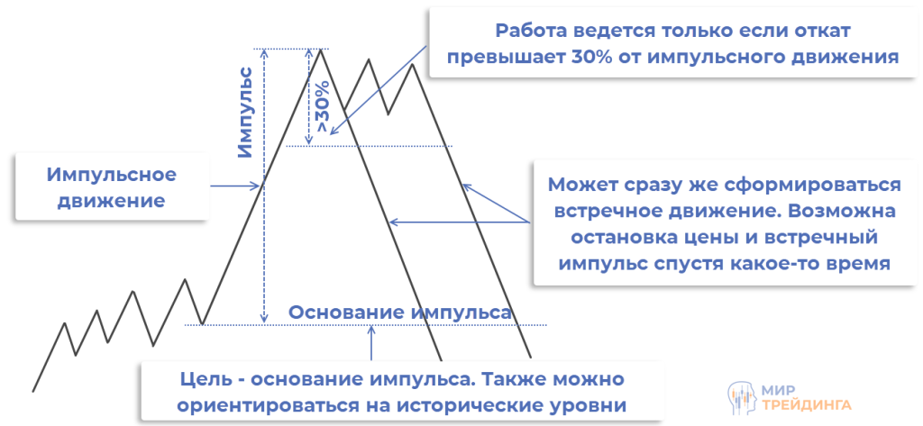 торговля ведется только при условии, что откат превышает 30% от величины импульса;
