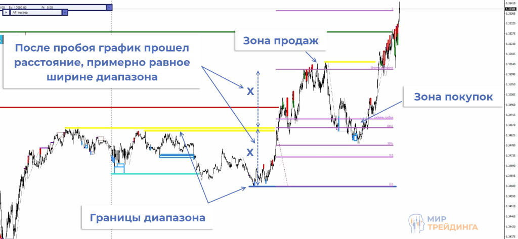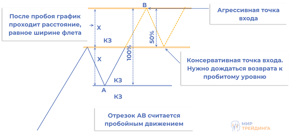 после пробоя график должен пройти в это направлении расстояние, как минимум равное ширине диапазона. На схеме оно обозначено «Х»,