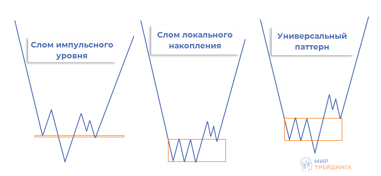 - универсальный паттерн. Также формируется локальное накопление, затем идет попытка продолжения движения в прежнем направлении и импульсный рывок в обратную сторону.