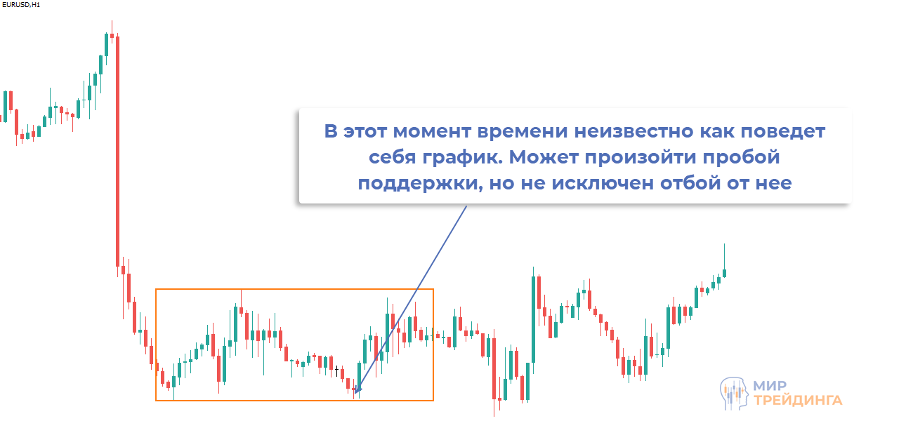 - в момент подхода к графику мы еще не знаем как будут развиваться событий. Самого факта касания границы накопления недостаточно для заключения сделки. Нужен подтверждающий паттерн;