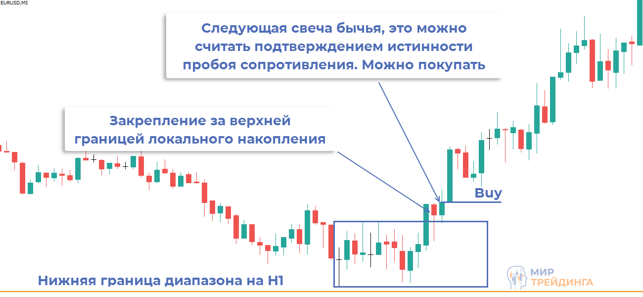 - импульсом (серия свечей одного цвета) пробивается верхняя граница этого накопления на М5;
