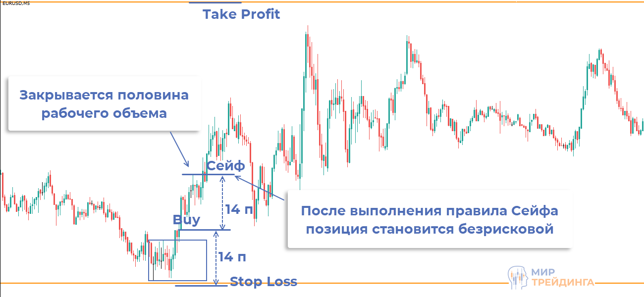 Для удобства рекомендую дробить рабочий объем на 2 равные части и входить в рынок 2 сделками одновременно. При выполнении правила Сейфа достаточно закрыть одну из позиций.