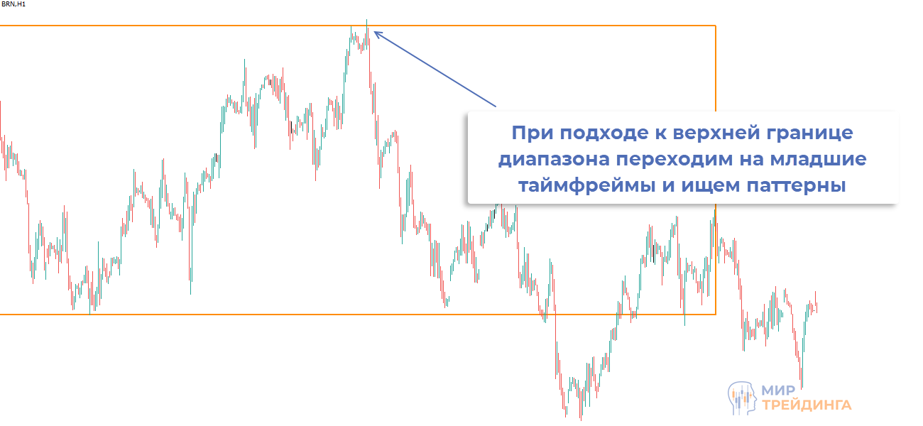 Для наглядности разберем сигнал по нефти марки Brent. При поиске точки входа не использовались индикаторы для трейдинга, только диапазоны и соответствующие паттерны: