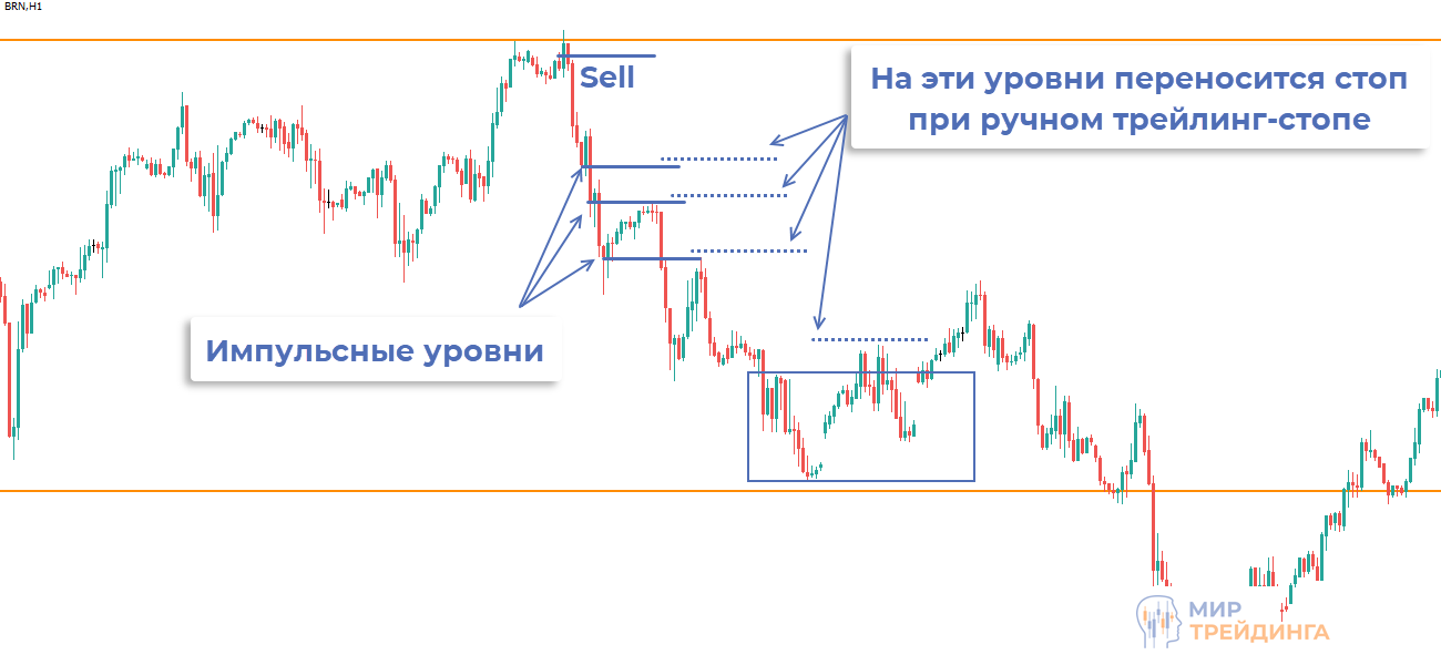 - по ходу нисходящего движения формируется серия импульсных уровней, диапазонов. Их можно использовать для ручного трейлинг-стопа. Переносим SL за них, за счет этого защищаем часть профита. В итоге позиция закрывается по стопу, но к этому моменту он уже был в безубытке.