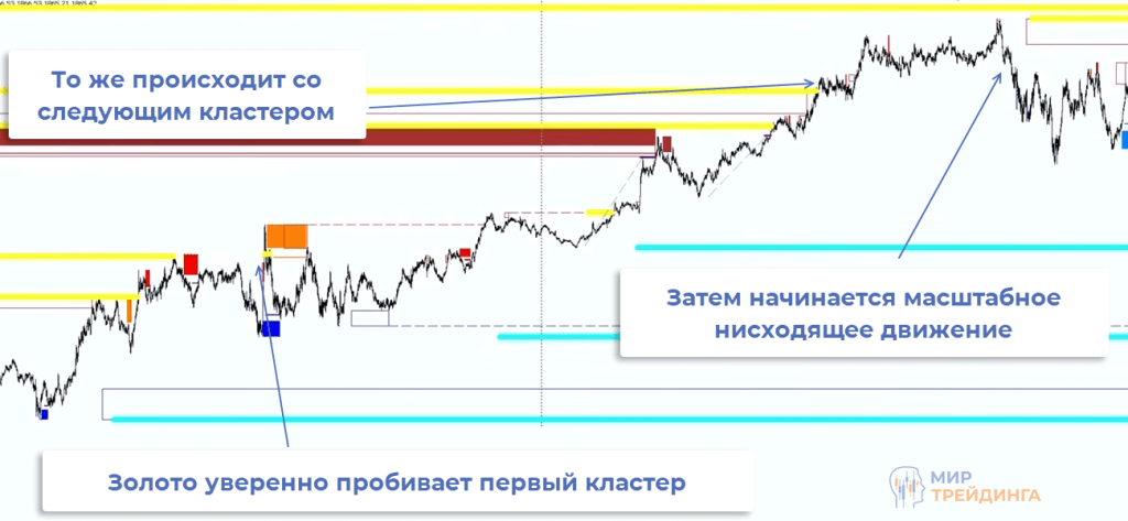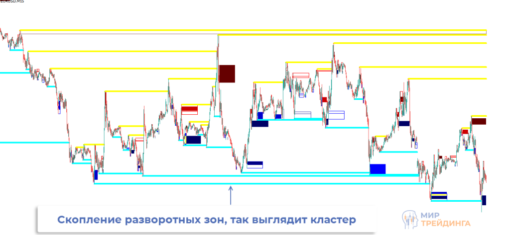 Под кластером понимается скопление разворотных зон, расположенных на небольшом расстоянии друг от друга. Вместе они формируют мощную поддержку/сопротивление, растет вероятность полноценного разворота или как минимум коррекции.