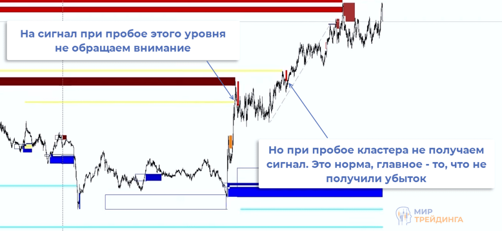 Сигналы формируются не на каждом кластере. Иногда они все же пробиваются и движение продолжается без хорошей точки входа. Такие ситуации не стоит рассматривать как упущенную прибыль. Ключевое здесь то, что не получен убыток.