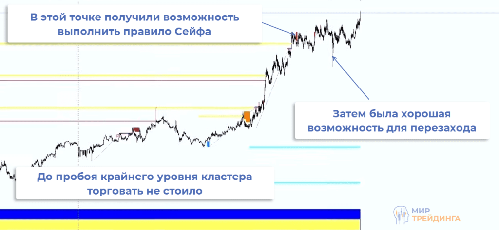 В примере ниже сигнал возникал после пробоя крайнего уровня кластера. Неидеальная точка входа, но могли выполнить правило Сейфа, позже были условия для перезахода.