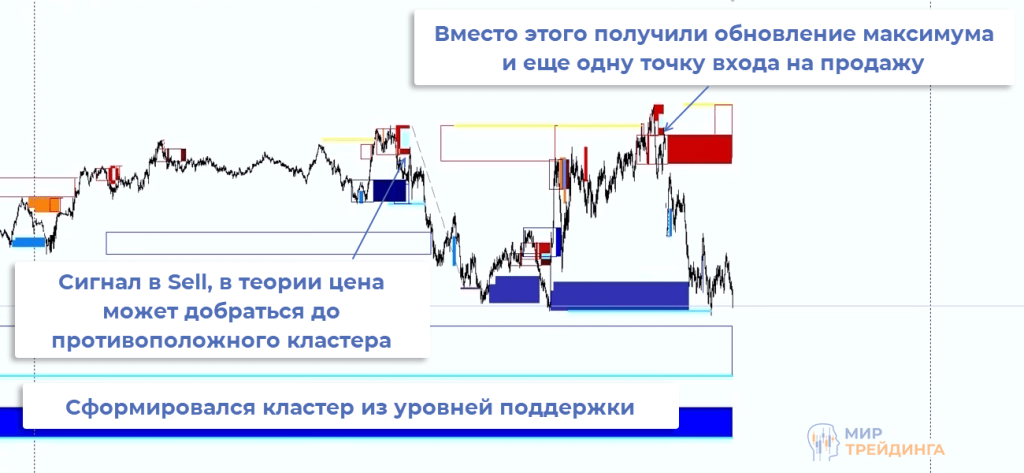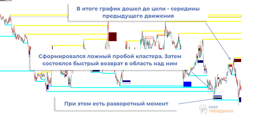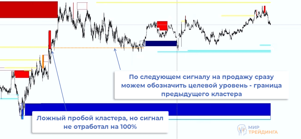 Одна из особенностей кластера – ложные пробои массива разворотных зон. Это ситуация, при которой происходит заброс за кластер (за крайнюю разворотную зону) и быстрый возврат. Часто после этого формируется разворотный момент и сигнал для входа в рынок.